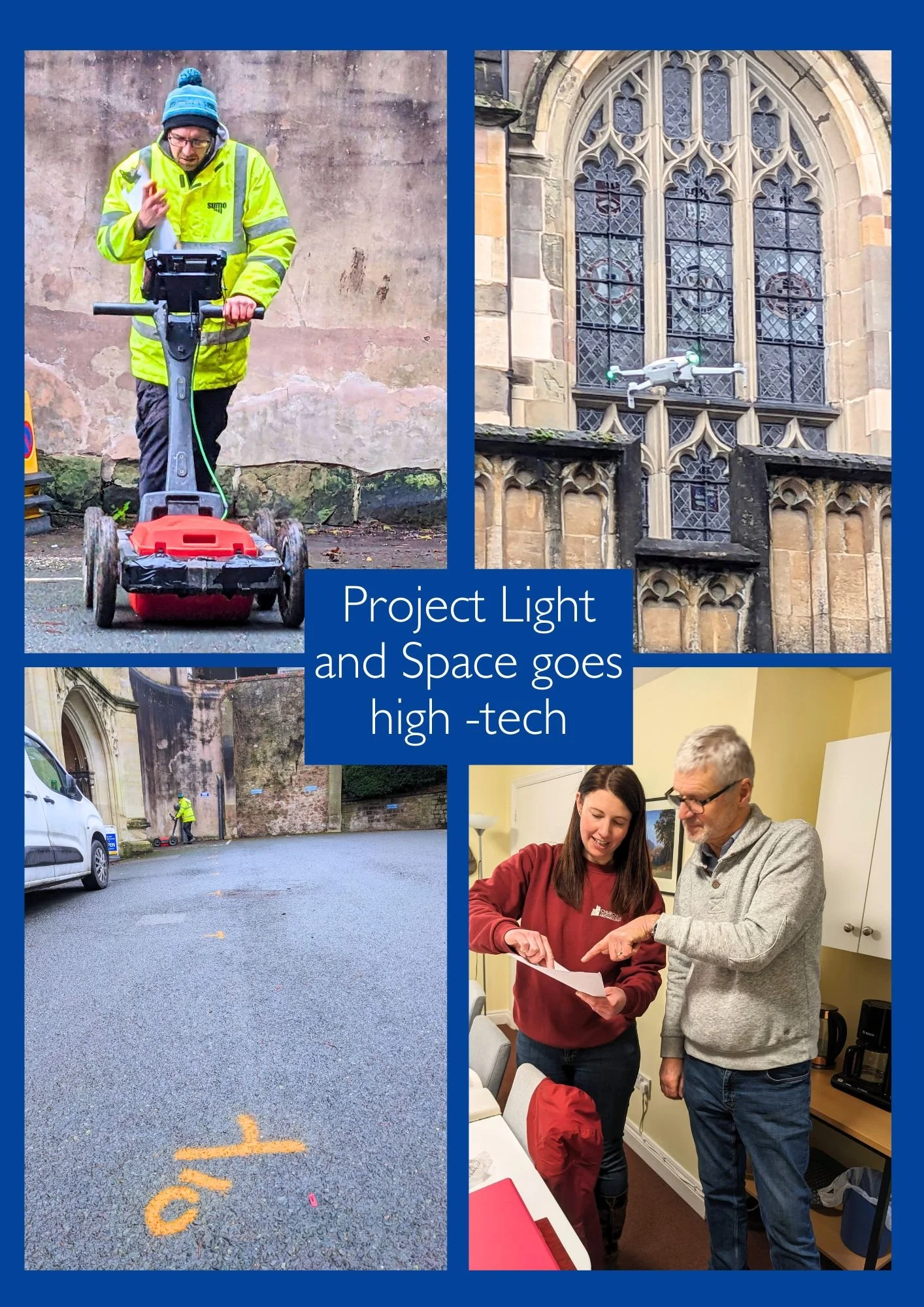 What may have looked like a lawnmower without blades was actually a Ground Penetrating Radar rig. It sent pulses of microwave radiation into the ground, through both tarmac and grass, and measured the reflections which returned.